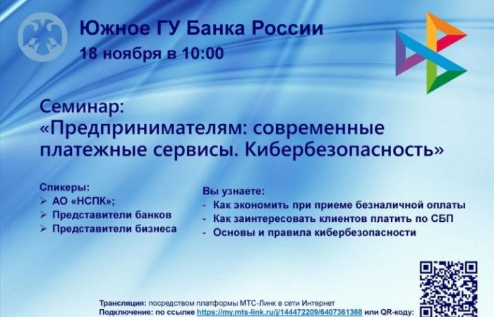 Южное главное управление Банка России приглашает субъекты малого и среднего предпринимательства Краснодарского края принять участие в вебинаре, посвященном современным и безопасным финансовым технологиям. Дата и