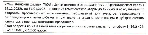 Горячая линия по вопросам профилактики инфекционных заболеваний для туристов 30.01.2026 Светлана Юндина Новости, Управление Роспотребнадзора по Краснодарскому краю