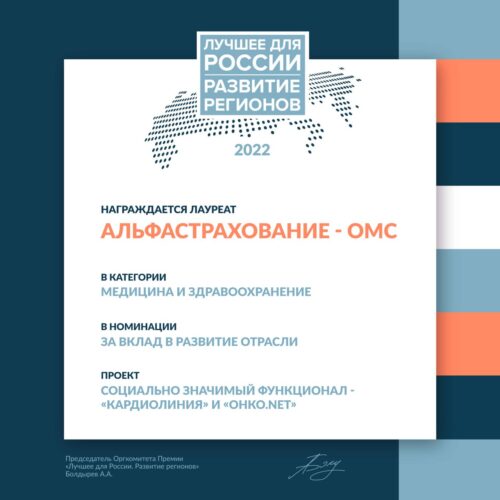 «АльфаСтрахование-ОМС» стала лауреатом премии «Развитие регионов. Лучшее для России» сразу в двух номинациях: «За вклад в устойчивое развитие России» в категории «Социальные проекты» и «За вклад в развитие отрасли» в категории «Медицина и здравоохранение». Премия создана в поддержку государственной региональной политики, направленной на обеспечение сбалансированного социально-экономического развития субъектов Российской Федерации, сокращение уровня межрегиональной дифференциации в социально-экономическом состоянии регионов и качестве жизни.