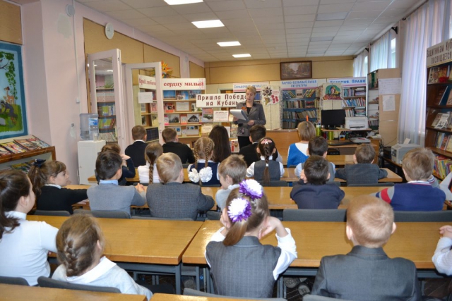 В рамках месячника по военно-патриотическому воспитанию в Кореновской районной детской библиотеке проходит цикл бесед о Великой Отечественной войне. Вот и 6 февраля в уютном читальном зале прошло мероприятие, посвященное освобождению нашего района от фашистских захватчиков, на которое были приглашены младшие школьники 1 и 19 общеобразовательных школ. Ведущая встречи рассказала ребятам о тяготах войны, ведь от нее больше всего страдают самые ма¬ленькие и самые старенькие. Были прочитаны письма детей войны. С замиранием сердца слушали ребята такие простые и такие страшные воспоминания тех, кто пережил все ужасы фашистской оккупации. На встречу со школьниками были приглашены солисты вокального коллектива КРЦНКД «Бабье лето», рук. Татьяна Ильчнко, которые подготовили литературно-музыкальную композицию « Дороги, опалённые войной» и исполнили попурри из песен военных лет.